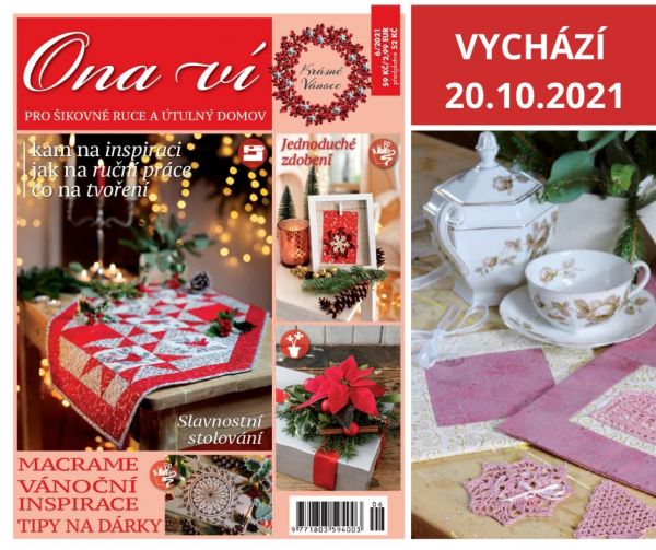 Klasické číslo Ona ví je spojené s krásnými svátky roku. Užijme si společně magické období od adventu až po konec roku! Každý si najde to své. Nechybí jednoduché, ale i tradiční či netradiční vánoční dekorace. Stejně tak návody a tipy, jak dekorovat svůj byt, či vyrobit vlastní vánoční ozdoby.